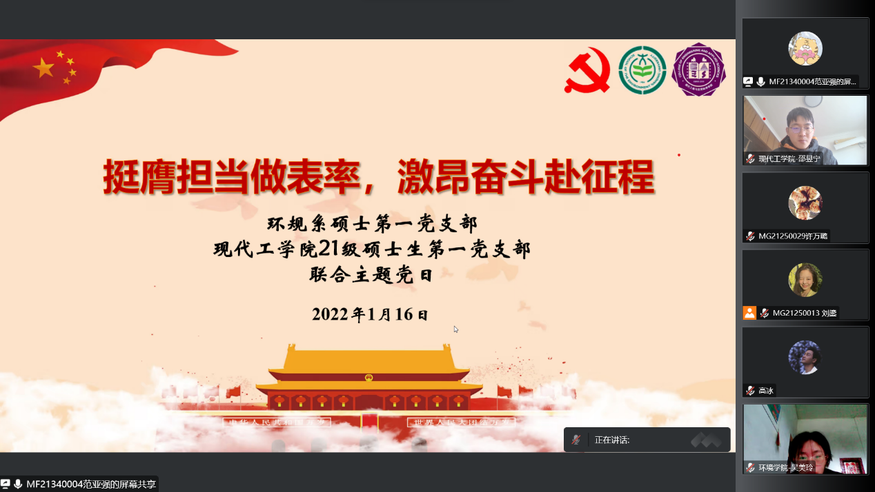 本次组织生活分为“习总书记新年贺词里的那些小彩蛋”主题党课、绿色时政在身边、科技报国勇担当、党员代表有话说四个环节。