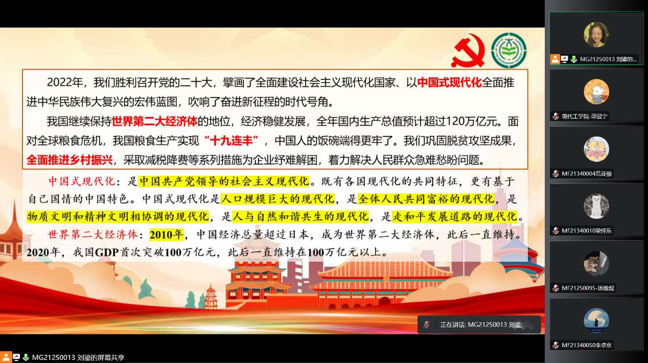 致广大而尽精微,一枝一叶总关情。在支部书记讲党课环节,环规系硕士第一党支部书记刘鎏以习总书记新年贺词里的那些“小彩蛋”为切入点,回顾了C919、海南自由贸易区、天宫空间站等2022年中国式现代化建设的累累硕果,同时立足充满活力、赓续民族精神、紧密联系世界的当下,展望了2023年亟待奋斗的未来。刘鎏同志强调,“路虽远,行则将至;事虽难,做则必成”,前途的曲折需要脚步来战胜,再难的目标也可以通过行动来完成,广大党员同志要踔厉奋发、笃行不怠,方能不负历史、不负时代、不负人民。