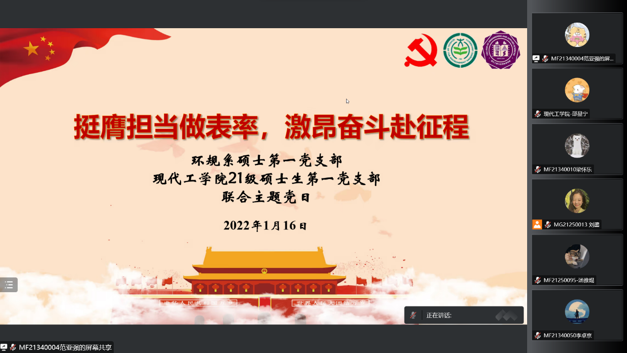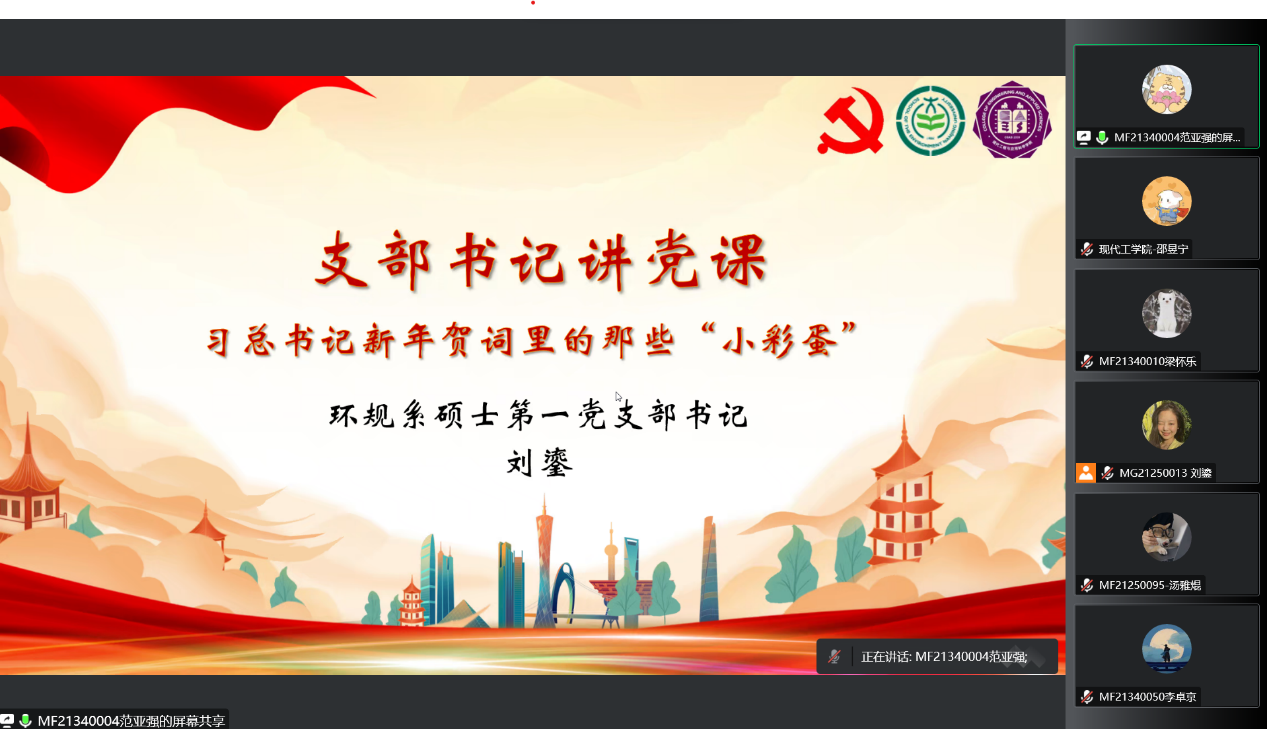 本次组织生活分为“习总书记新年贺词里的那些小彩蛋”主题党课、绿色时政在身边、科技报国勇担当、党员代表有话说四个环节。