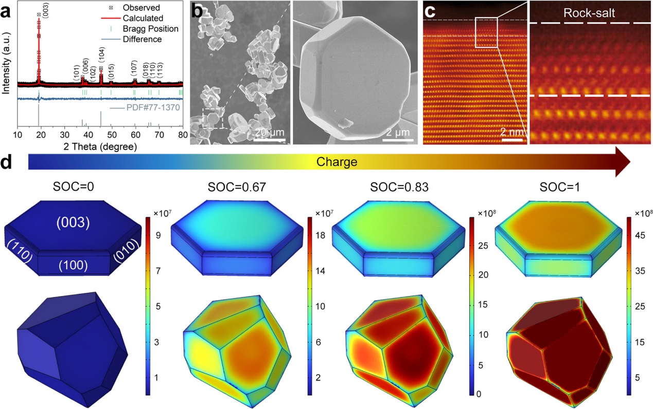 图1. P-LCO正极材料的结构与形貌特征。(a) P-LCO的精修XRD图。 (b) P-LCO的SEM图。(c) P-LCO的HAADF-STEM图像。(d) 通过有限元模拟研究P-LCO和LCO正极颗粒在充电过程中的应力分布情况。