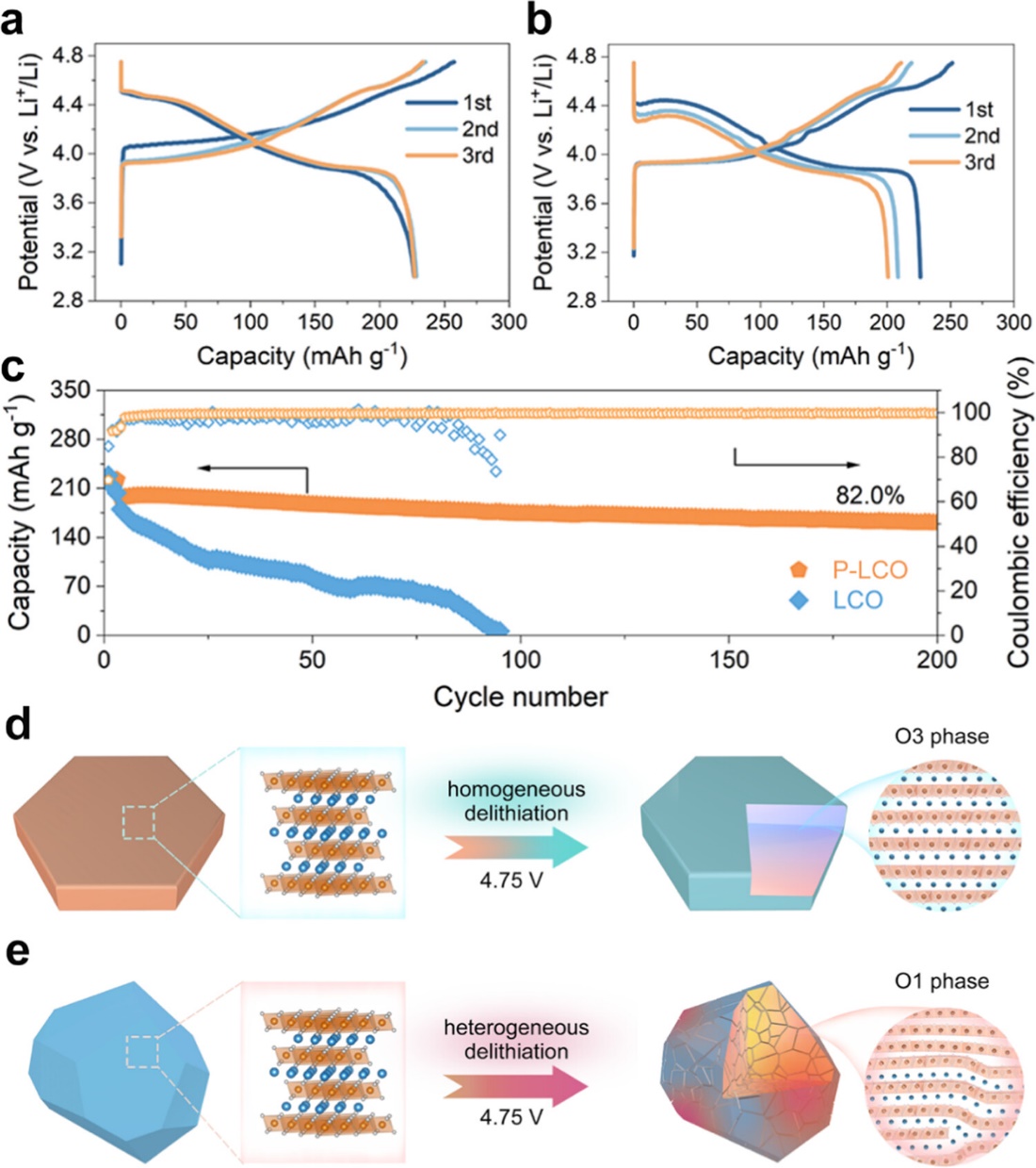 图5. 在3.0−4.75 V电压范围内对电化学性能的表征。(a) P-LCO正极和(b) LCO正极在0.2C倍率下的充放电曲线;(c) P-LCO和LCO正极在1C倍率下的循环稳定性;(d) P-LCO正极和(e) LCO正极中脱锂均匀性、结构演变、内部应力及退化机制之间相互关系的示意图。