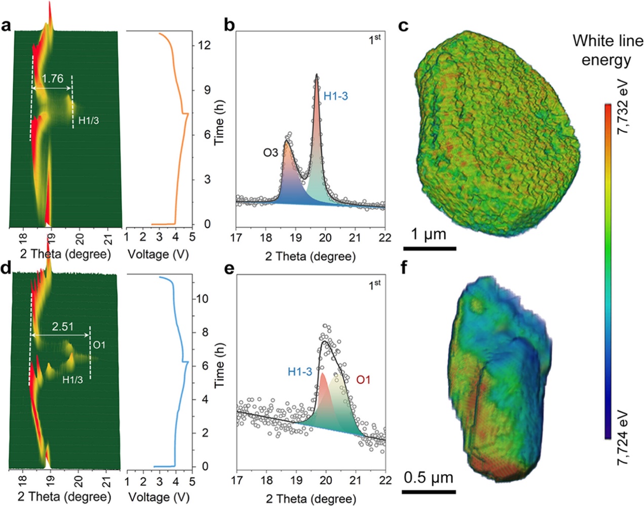 图2. 在4.75 V时正极材料的结构演变及脱锂均匀性分析。(a) P-LCO和(d) LCO正极在3.0 V至4.75 V电压范围内的首次充放电过程中原位X射线衍射(XRD)图谱及其对应的电化学曲线。(b) P-LCO和(e) LCO正极在充电至4.75 V时的XRD图谱。(c)充电状态下的P-LCO和(f) LCO正极颗粒的TXM-XANES映射图。