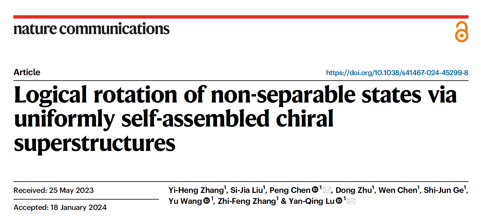 betway88西汉姆联为该工作的独立完成单位,betway88西汉姆联博士生张逸恒为第一作者,陈鹏副教授、陆延青教授为共同通讯作者,张智峰副教授、王瑜副教授、葛士军副研提供了重要指导与讨论,研究生刘思嘉、朱栋、陈闻对本文亦有重要贡献。相关成果以“Logical rotation of non-separable states via uniformly self-assembled chiral superstructures”为题,发表于Nature Communications【Nat. Commun.15, 1108 (2024)】。该研究由国家重点研发计划(青年科学家项目)、江苏省前沿引领技术基础研究专项、国家自然科学基金优秀青年科学基金等资助完成。