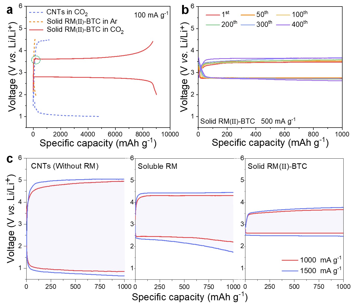 图2基于CNTs和固态RM(II)-BTC正极的Li-CO2电池电化学性能。(a)全充放性能对比;(b)定容循环性能对比;(c)大电流倍率性能对比。