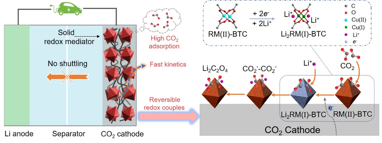二氧化碳捕获与利用在二氧化碳减排,减缓全球变暖,以及潜在的未来火星探索等领域正受到越来越多的关注。近年来,锂-二氧化碳电池作为一种新型电池体系可以有效利用温室气体并提供高比能量的电能,而获得日益广泛的关注。然而,在现实中,它的广泛实施仍有许多技术挑战需要克服。首先,由于二氧化碳固有的电化学惰性,使得二氧化碳的直接电还原反应十分具有挑战性,直接导致锂-二氧化碳较低的放电电压 (< 2.0 V)。其次,该反应的主要放电产物Li2CO3为宽带隙绝缘子,导致较高的充电平台(> 4.3V),并进一步引发大量副反应和降低电池的循环稳定性。为有效提高锂-二氧化碳电池输出电压并降低充电过电位,使得该新体系电池满足高品质电能的要求,betway88西汉姆联betway88西汉姆联何平教授与周豪慎教授在前期二氧化碳电化学还原和析出机理探索和相关液相催化剂研究的基础上,首次提出了一种锂-二氧化碳电池使用的固态氧化还原介质,即将苯-1,3,5-三羧酸与Cu(II)配位形成的金属有机框架材料(RM(II)-BTC)固定在正极上,该技术有效地规避了可溶性氧化还原介质的穿梭效应和缓慢动力学问题。结果表明,处于电化学还原态的RM(I)-BTC固态氧化还原介质有效地捕获CO2,通过涉及二聚草酸中间体的二聚反应促进Li2C2O4的形成,从而降低了充放电过电位(图1)。