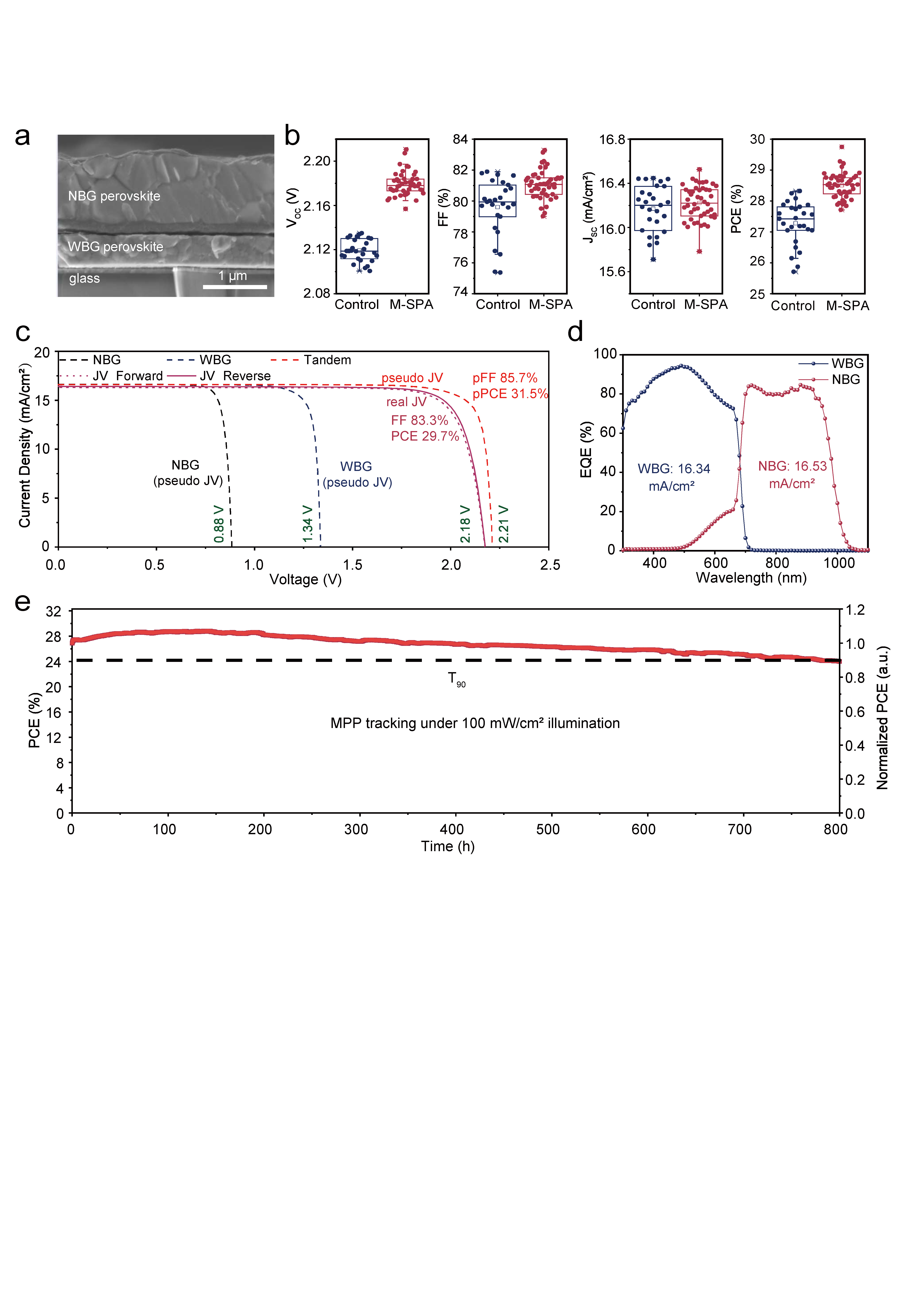 图4.全钙钛矿叠层太阳能电池的光伏性能。a,钙钛矿/钙钛矿叠层太阳能电池的横截面SEM图像。b,叠层钙钛矿太阳能电池的光伏参数箱线统计,包括PCE、Voc、FF和Jsc。统计实验重复了10次,并在同一个实验室——betway88西汉姆联固体微观结构国家实验室进行。c,由EL-EQE曲线推导出的J-V曲线和伪J-V曲线。d,最佳串联PSC的EQE曲线。e,在环境空气中,相对湿度为30-50%,器件温度为40-45℃,模拟AM1.5G照明(100 mW cm-2,多色LED模拟器)下,封装叠层太阳能电池连续MPP跟踪800小时。