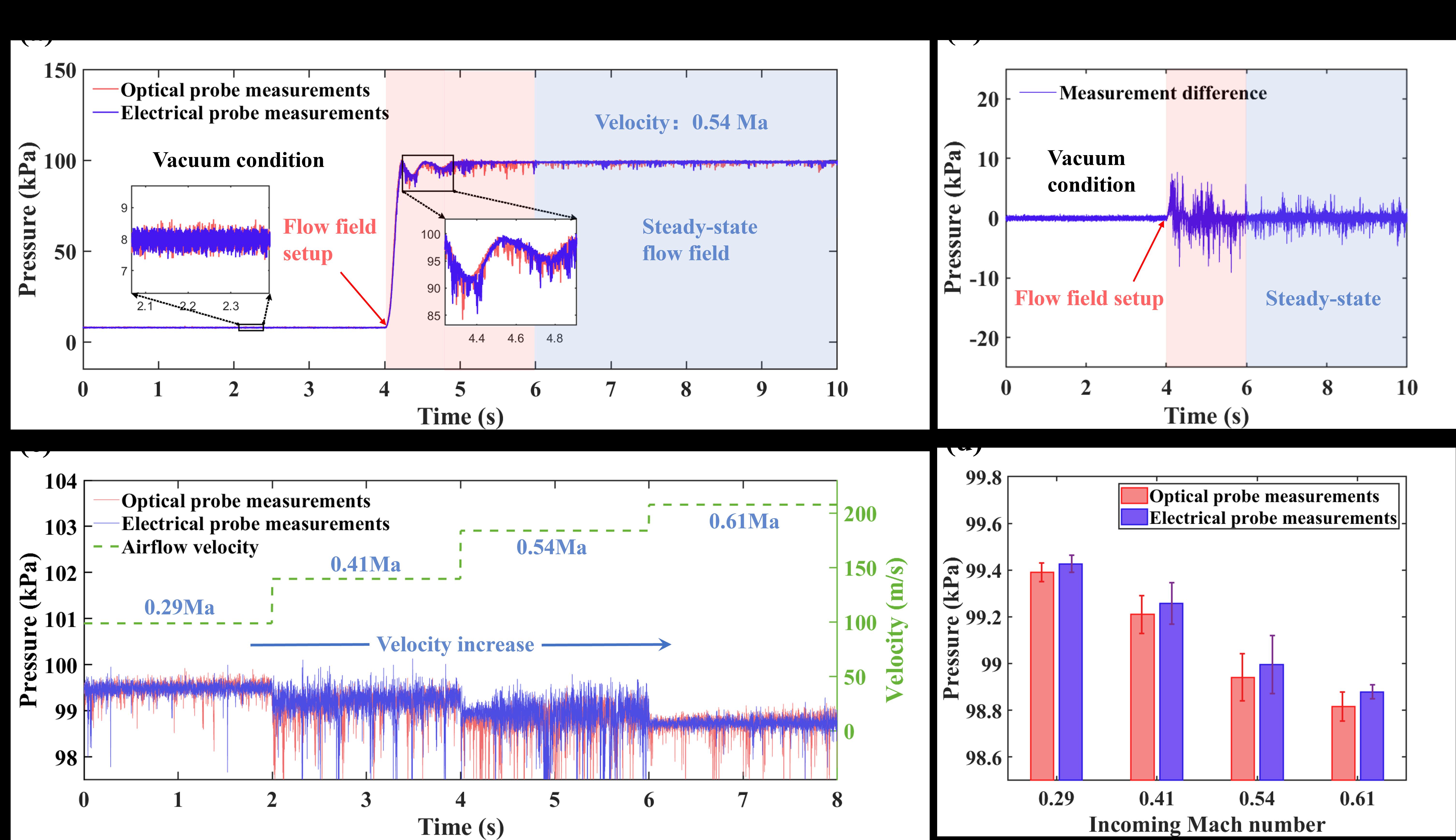 搭配该团队自研的高速解调系统,该微型光纤压力探针被应用于亚声速风洞(马赫数 0.29 - 0.61)流场测量。相比于大尺寸的压阻式电学压力探头,光纤压力探针无需导管引流,可以直接安装在流场内部进行测量,因此具有更短的响应时间以及更小的传输损失。
