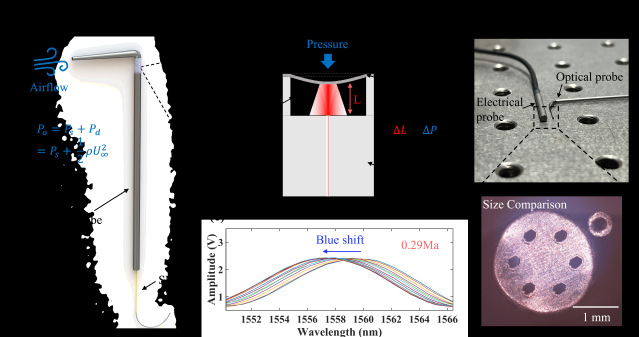 近年来,光纤传感器凭借尺寸小、精度高且抗电磁干扰能力强等优势,在航空航天测量领域显示出巨大潜力。基于光纤法布里珀罗(Fabry–Pérot,FP)传感器的快速响应气动探针已经被成功应用于高速矢量流场测量、高温高压涡轮机械流场测量等场景中。然而,受限于当前微加工技术,目前的光纤FP传感器往往在尺寸大小、使用场景(高温、腐蚀性环境等)以及传感器灵敏度、线性度等参数方面有所取舍。因此,开发能够同时实现小型化、环境适应性强和高线性度等的快速响应气动探针,仍然是极端流场表征领域的一项重要研究挑战。