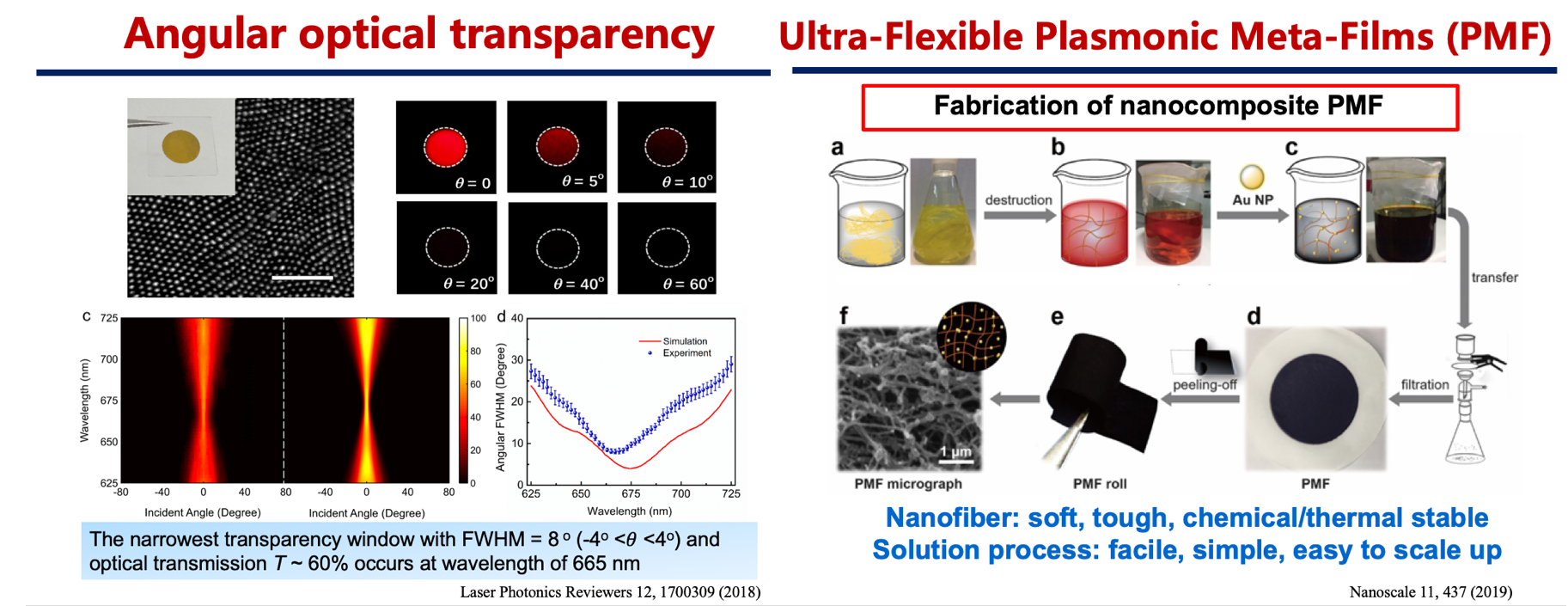 首先,徐挺教授介绍了三维体块超构材料的光场色散调控机理及应用。通过在调节金属纳米线阵列超构材料的色散等频率面,使其拓扑形态发生椭球面到双曲面的拓扑转变,从而可以在临界点附近实现角度选择透明现象。结合理论参数设计,通过电化员工长的方法在多孔氧化铝模版中填充银纳米线,课题组合成了大面积的光学超构材料薄膜,并在实验中获得了极窄的光学透明窗口。此外,通过自组装的微纳加工方法以及界面阻抗匹配原理,课题组还合成了大面积的全角度、宽带光学超构材料完美吸收器。