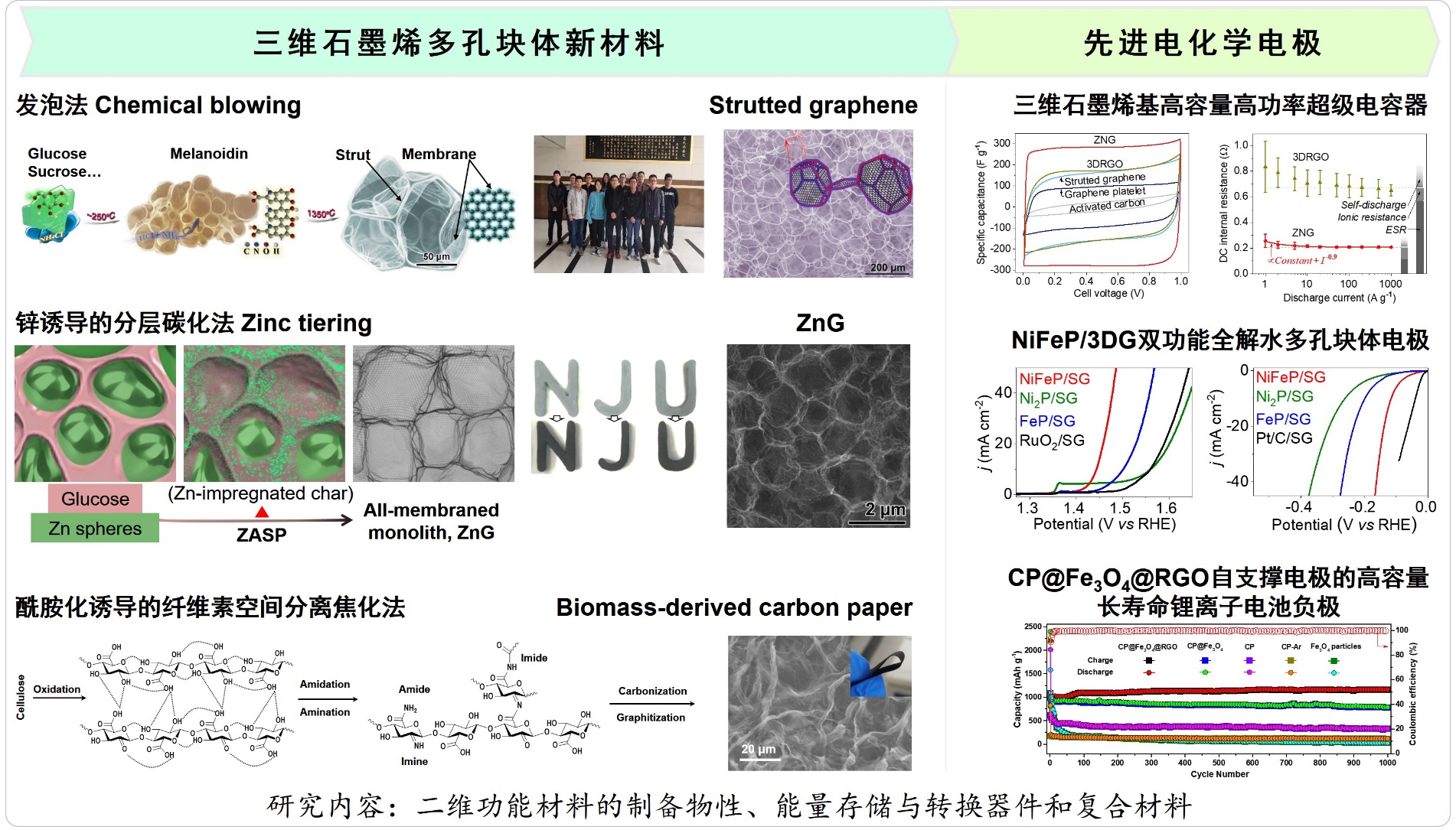 王学斌课题组继续将这些三维石墨烯新材料,用作先进的电化学电极,实现了优异性能。使用三维石墨烯作为双电层型超级电容器的电极,实现了卓越的能量密度、功率密度、寿命。其中,基于锌分层法制备的三维石墨烯ZnG,其超级电容器具有优秀的比电容(达336 F/g)、最大功率密度(625 kW/kg)、能量密度(11.7 Wh/kg)、循环稳定性(超过1百万圈)、全寿命周期储能密度(15 MWh/kg),远优于传统储能器件。利用筋撑石墨烯SG负载NiFeP纳米片,作为三维自支撑电极,可以高效电催化析氧、析氢、全分解水(全解水的开启电压仅1.54 V)。利用三维碳网络carbon paper负载Fe3O4,再包覆还原氧化石墨烯RGO,该自支撑三维网络复合电极CP@Fe3O4@RGO作为锂离子电池负极,具有超长循环寿命(超过2000循环)、高比容量(1160 mAh/g)。三维石墨烯制备和性质及应用研究是一个研究热点,三维石墨烯不仅用作电化学电极,其应用场景十分广泛,前景广阔。