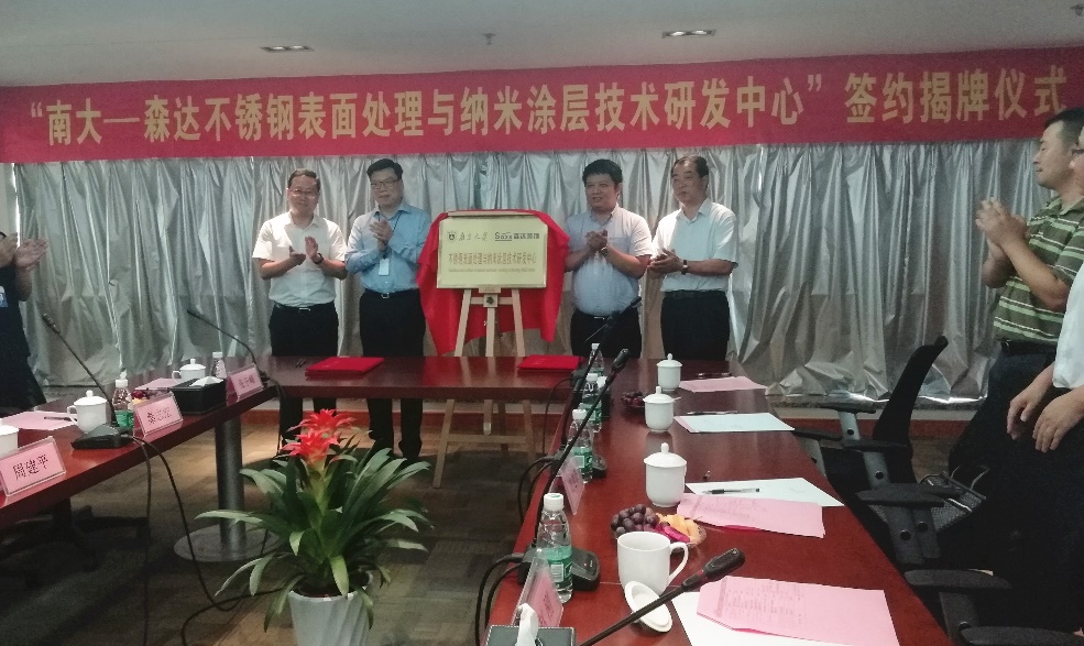 2018年8月8日下午,betway88西汉姆联海安高新技术研究院与金轮蓝海股份有限公司下属海门市森达装饰材料有限公司合作共建 “南大—森达不锈钢表面处理与纳米涂层技术研发中心”签约揭牌仪式在金轮蓝海股份有限公司总部举行。公司创新创业与成果转化工作办公室副主任古公亮和公司助理经理赵刚出席了签约揭牌仪式。