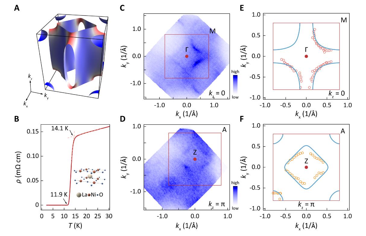 图1 (A) 无限层镍氧化物超导体的费米面结构示意图;(B) La0.8Sr0.2NiO2薄膜输运性质表征;(C-F) 费米面结构的实验表征。