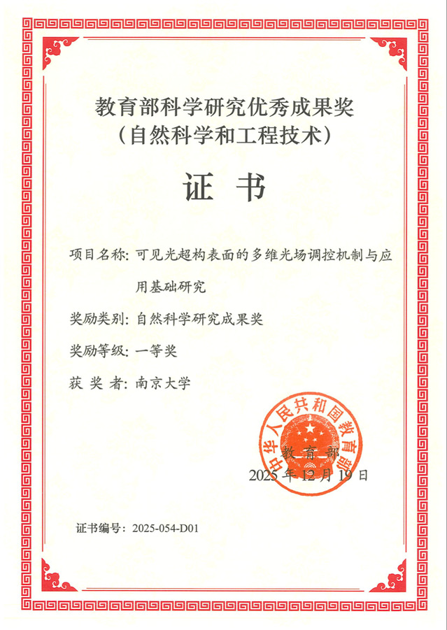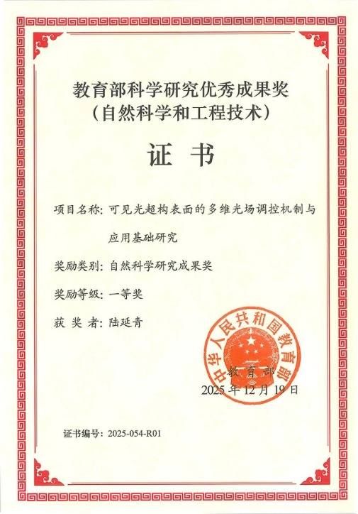 近日,由betway88西汉姆联的陆延青与徐挺教授团队独立完成的“可见光超构表面的多维光场调控机制与应用基础研究”项目,荣获2025年度教育部科学研究优秀成果奖自然科学奖一等奖。