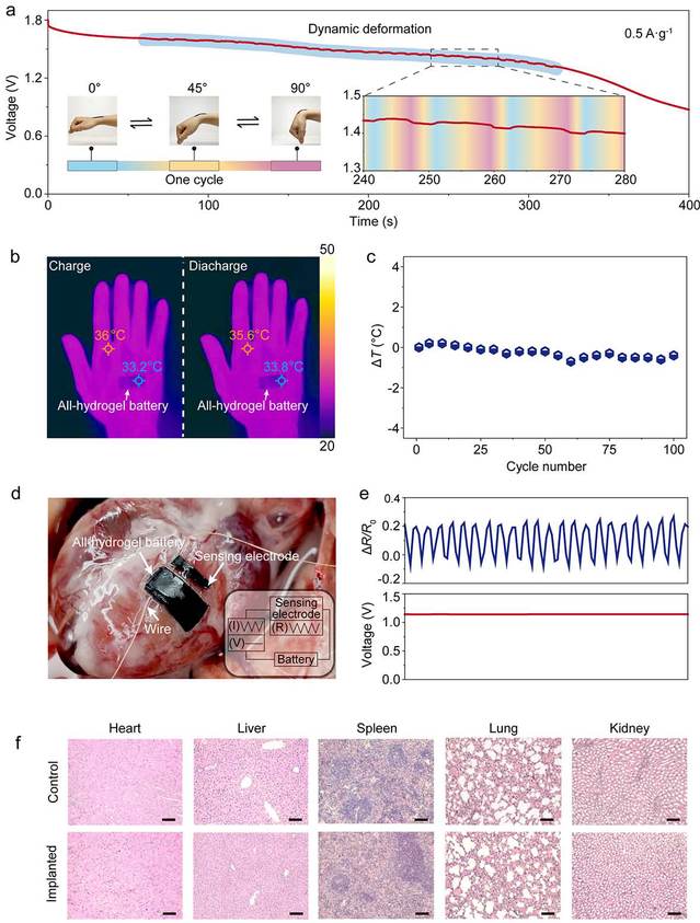 伴随着优异的电化学性能,全凝胶电池表现出80 kPa的低杨氏模量,与人体组织(例如皮肤和心脏)的杨氏模量相匹配,使全凝胶电池能够与人体组织有效贴合。除此之外,电极-电解质界面的粘附及其结构完整性使得全凝胶电池能够在弯折,拉伸和扭曲等多种变形后保持电化学性能的稳定。特别的是,即使在苛刻的剪切变形5000次之后,其电化学性能依然可以保持不变。与目前已报道的柔性电池相比,该工作制得的全凝胶电池表现出优异的结构稳定性和与组织相匹配的力学性能,满足在复杂变形和体内植入等应用场景下的使用要求。例如,将全水凝胶贴在手腕上,随着手腕的运动,全凝胶电池可以紧紧地贴在手腕上并随手腕同步运动,且运动过程中全凝胶电池表现出稳定的放电性能。此外,将全凝胶电池与水凝胶传感集成后贴在心脏表面,超柔软的集成器件与心脏形成紧密稳定的接触,可以准确检测到心脏生理信号。