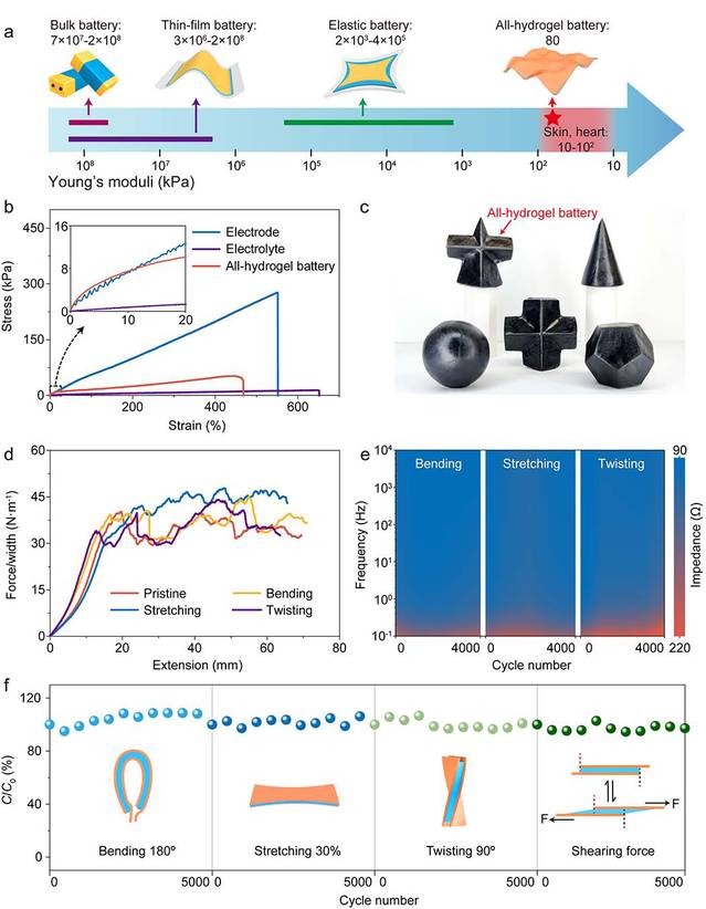 近年来,可穿戴和可植入生物电子器件蓬勃发展,在疾病诊疗、大健康、人机接口、电子通讯等领域显示出巨大的应用前景。能源系统如各种化学电池是植入式电子器件的心脏,为其提供能量。然而目前使用的刚性电池系统,无法与柔软的生物组织相匹配,迫切需要开发与生物组织力学性能(如杨氏模量)相匹配的的柔软电池,确保在动态变形下,器件与不规则生物组织表面的持续稳定贴合并最大程度减少组织应力;同时缓解物理扰动及其对组织的损伤,从而减轻异物反应和健康威胁。