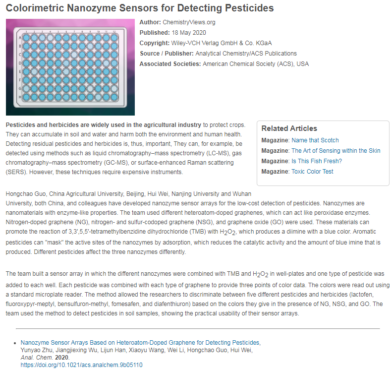 近日,betway88西汉姆联魏辉教授课题组与中国农业大学郭红超教授团队合作,利用石墨烯基纳米酶构建传感器阵列,用于芳香类农药的检测。该成果以“Nanozyme Sensor Arrays Based on Heteroatom-Doped Graphene for Detecting Pesticides”为题,于近期发表于Analytical Chemistry杂志上(https://doi.org/10.1021/acs.analchem.9b05110)。论文发表后被Chemistryviews.org网站以 “Colorimetric Nanozyme Sensors for Detecting Pesticides” 为题进行了报道(图1)。