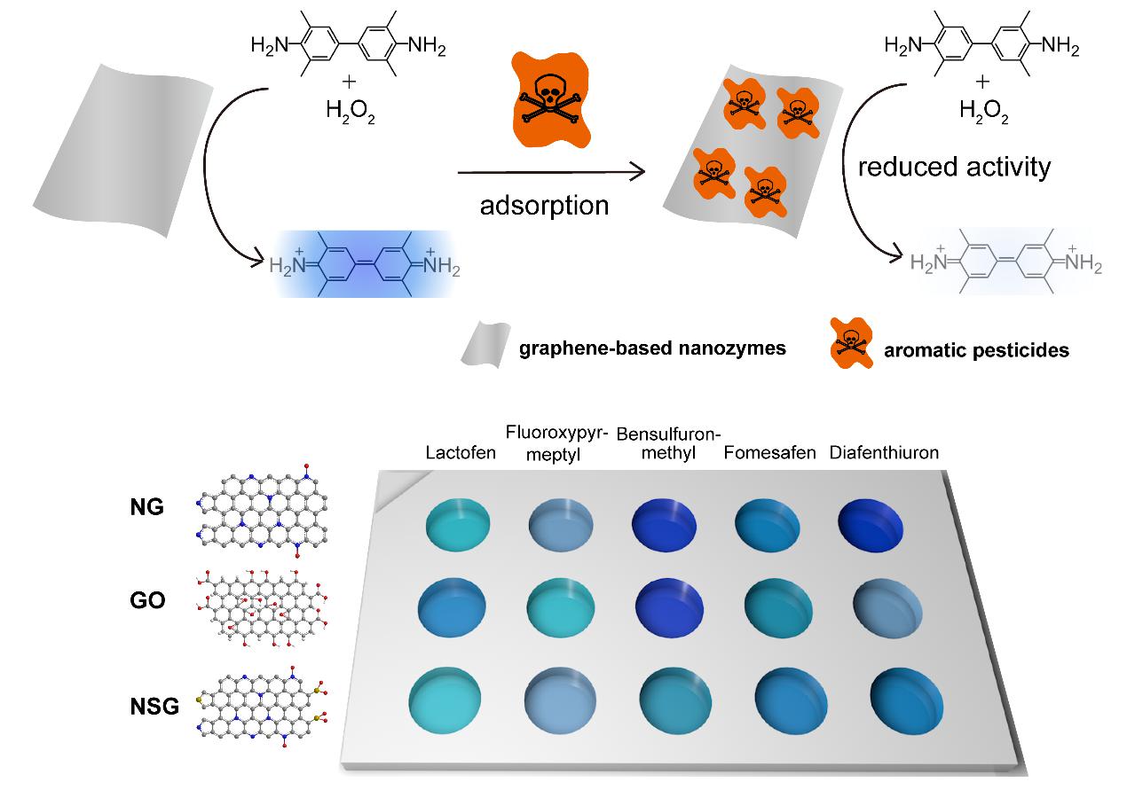 图2. 石墨烯基纳米酶构建的传感器阵列用于芳香类农药检测的机理。