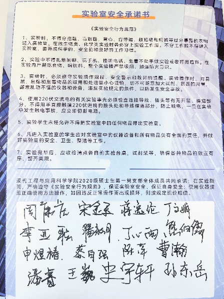 为了更好发挥党员先锋模范带头作用,支部草拟了《实验室安全承诺书》,支部书记周康虎在带领所有成员认真阅读后,率先在承诺书上签名,全体成员纷纷在承诺书上郑重签字,表明已经认真了解实验室安全的相关要求,并且会在日常实验中严格遵守纪律。支部希望通过举办此次党日活动,增强安全红线意识和底线思维,切实保障师生的人身安全和学校的财产安全。