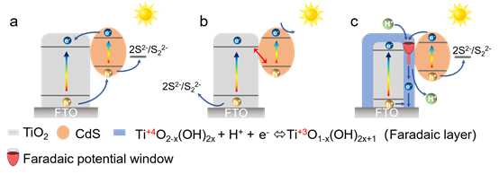 图1. (a) II型异质结电子传输理论,(b) Z型异质结电子传输理论,(c) 法拉第结电子离子耦合传输新理论