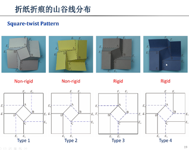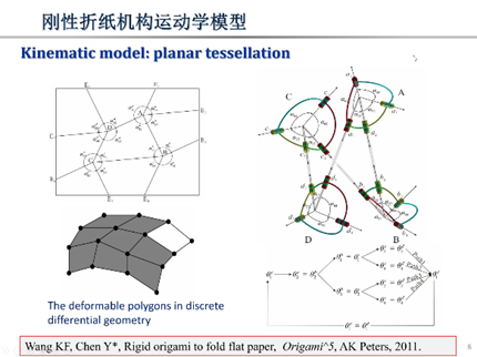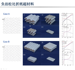报告中介绍了基于刚性折纸来设计和分析超材料的方法。首先,从机构运动学角度来设计折痕的分布。其中,采用刚性折纸机构运动学模型可以很好的预估材料中间构型的变化,同时配合折纸折痕的山谷线分布设计,可以实现材料刚性折叠或非刚性折叠。