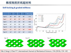 然后,根据折叠的变形机理,分析所获得的超材料的机械性能,设计性能可以调控和编程的新型折纸超材料。由于对机构运动学的过程有十分透彻的了解,陈焱教授设计出了很多独特的超材料结构,包括通过调控山谷线分布的形式,设计出不同的负泊松比折纸超材料。以及通过折纸结构的渐变,实现层间刚度的渐变以获得梯度刚度折纸超材料。