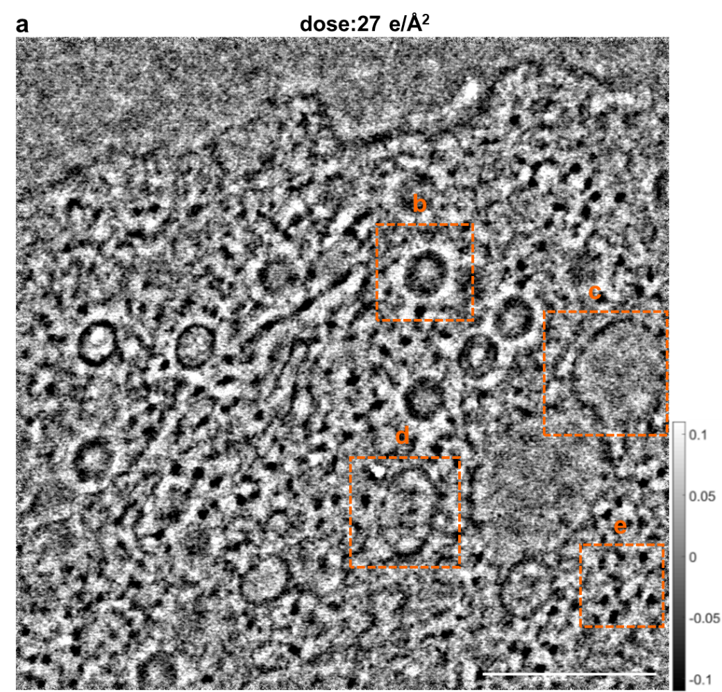 图3所示为腺病毒颗粒感染的细胞在低电子剂量条件27 e/Å2的叠层成像相位图像,成像区域大小为1.14 × 1.14 μm。细胞内亚结构衬度清晰可见,如腺病毒颗粒(b)、空泡(c)、运输小泡(d)、游离ribosome蛋白颗粒(e)等,且这些亚结构的内部结构衬度清晰,如b中的腺病毒颗粒,壳层六边形结构明锐,结构核部遗传物质清晰可见。该结果表明叠层衍射成像可实现生物样品在低电子剂量条件下的微米级大区域成像。