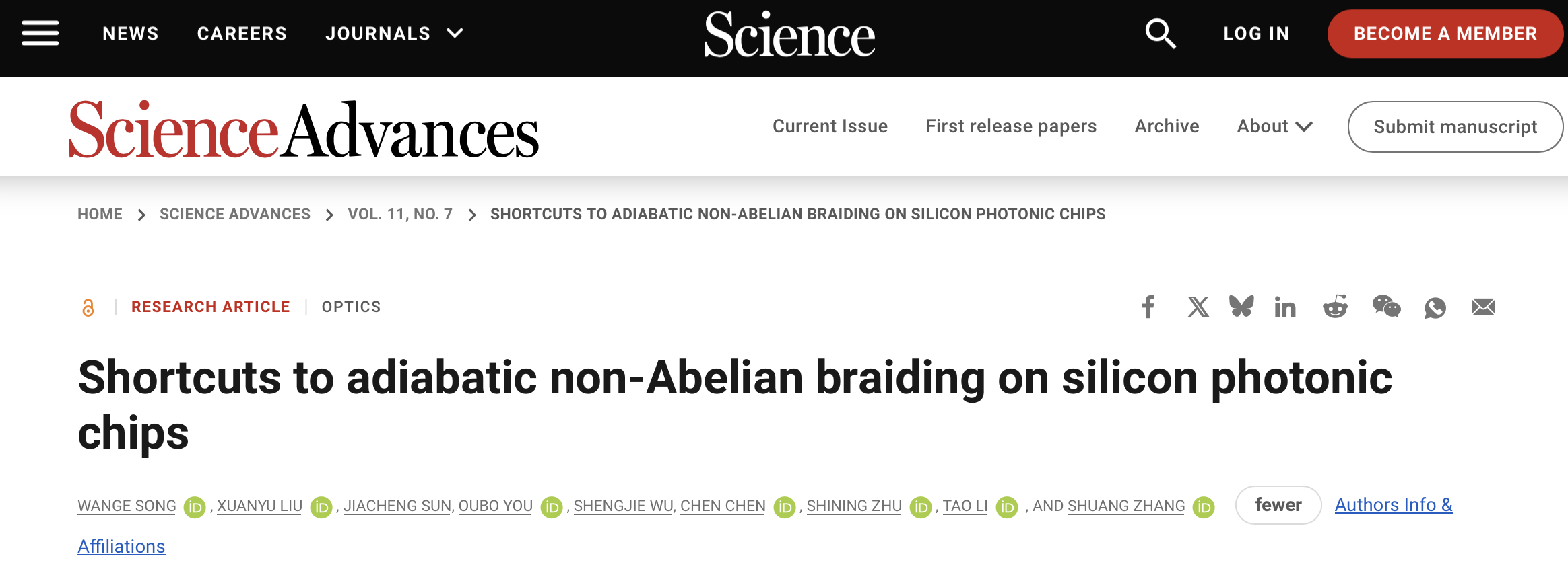 该成果以“Shortcuts to adiabatic non-Abelian braiding on silicon photonic chips”为题发表于Sci. Adv. 11, eadt7224 (2025) 上。该论文第一作者是betway88西汉姆联副研究员宋万鸽博士,betway88西汉姆联博士研究生刘轩宇和孙嘉程为共同第一作者。通讯作者为betway88西汉姆联李涛教授及香港大学张霜教授,该工作得到祝世宁院士的悉心指导。