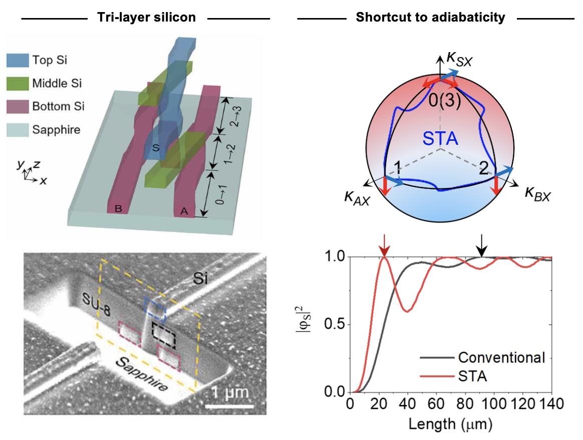图2. 在三层集成硅波导中利用绝热捷径策略实现快速编织效应。