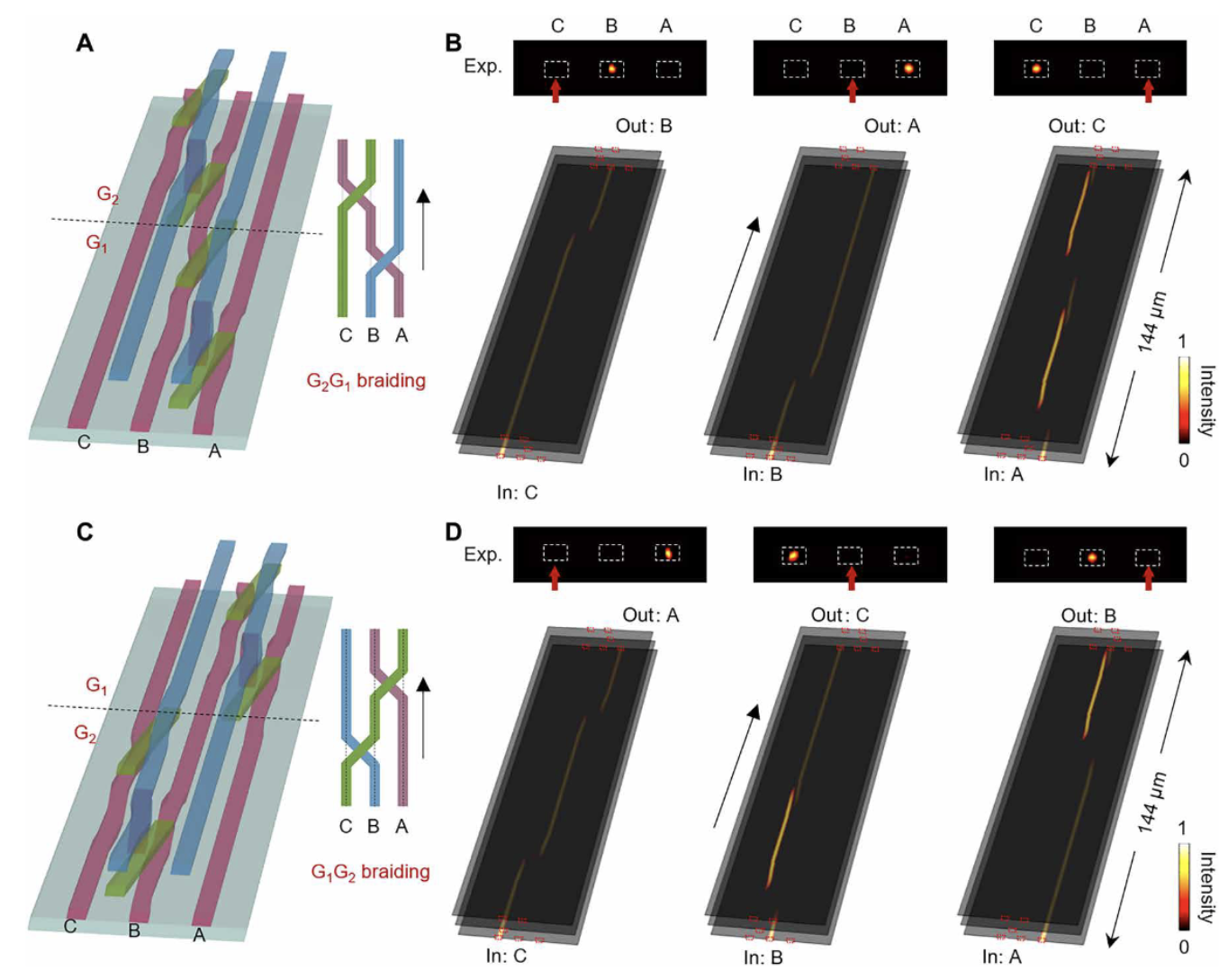 近年来,非阿贝尔编织现象已扩展到光和声的经典波系统,表现为Berry-Wilczek-Zee(BWZ)相位的多模几何效应,这是标量Berry相位的矩阵推广。在光子学和声学领域,具有非阿贝尔特性的多态编织已经成功实现。尽管这些操作在光子量子逻辑等应用中具有巨大潜力,但绝热条件的限制使得其实际应用变得困难。构建紧凑型光子非阿贝尔系统对于研究复杂的非阿贝尔现象和开发实用的光子器件具有重要意义。硅上绝缘体(SOI)光波导系统具有高密度集成的优势,但由于编织结构的复杂性(通常需要三维结构),在硅基集成光子芯片中实现这些结构仍然是一大挑战。南大-港大联合团队的前期工作中(Sci. Adv. 10, eadn5028 (2024)),已开发出双层硅波导体系演示了拓扑泵浦效应,为进一步构建复杂非阿贝尔光子结构提供了可能性。