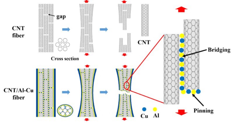 针对这一问题,公司betway88西汉姆联孟祥康教授课题组通过磁控溅射工艺在碳纳米管纤维表面沉积超薄的铝-铜复合薄膜并经退火与致密化处理,使金属元素扩散至碳纳米管纤维内部形成纳米颗粒达到降低碳纳米管间的接触电阻的目的,显著提高了复合材料电导率。拉伸变形时,分布在碳纳米管间的颗粒起到“桥接”的作用,分布在顶端的颗粒会起到“钉扎”作用,两种纳米颗粒增加了碳纳米管之间的滑移阻力,从而显著提高了复合材料抗拉强度和弹性模量。该结构实现了碳纳米管金属复合材料电导率和强度的同时增加,获得了具有超高强度(6.6 GPa)、弹性模量(500 GPa)和电导率(1.8*107 S/m)的碳纳米管铝-铜纳米复合材料。