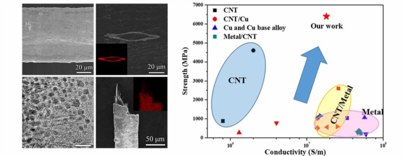 碳纳米管/铝-铜复合纤维形貌和微观结构、电导率vs强度关系及单轴拉伸增强机理