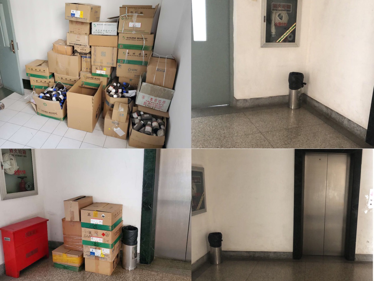 4、针对鼓楼校区科技馆3楼、4楼原学院用房的公共区域长期违规多处堆放实验废弃物而且因时间久远无法追溯归属的情况,经与各课题组沟通协商,大家齐心协力,在一周内完成了40余箱空瓶和废液等试验垃圾的清理工作,科技馆公共区域环境得到明显改善,重新恢复了干净整洁的面貌,受到师生一致好评。