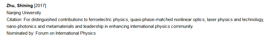 祝世宁院士当选2017美国物理学会会士(APS Fellow)。详见:https://www.aps.org/programs/honors/fellowships/archive-all.cfm?initial=&year=2017&unit_id=&institution=