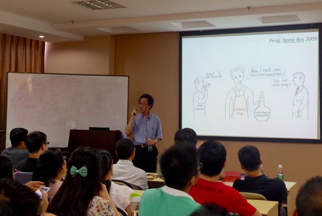 彭笑刚教授讲座题目为Synthetic Control of Excited-States Properties of Quantum Dots。本次讲座主要回顾了量子点的发展历史,总结了相关技术问题并提出激发态合成的解决办法。彭笑刚教授在业内被誉为Synthesis King,他的研究小组主要从事胶体纳米晶体的研究,涉及到胶体纳米晶体的合成,晶体机理的探究,在光学光谱以及物理化学上的应用。尤其是他有关CdSe的合成工作,让人叹为观止。彭笑刚教授用幽默诙谐的语言向我们介绍了他的研究工作,强调量子点作为人类迄今为止发现的最好发光材料将彻底改写下一代显示技术。彭笑刚教授认为,量子点较OLED在寿命、良品率、稳定性方面有很大优势,而OLED本征半峰宽较宽,也使得其在色域方面表现难以提高。目前,市面上的OLED电视是通过制备白光OLED的方式实现量产,而不是三原色主动发光,存在着色彩降低、能耗增加、价格高等问题。对于量子点的未来,彭笑刚展示了一幅惊人的蓝图。“未来,通过量子点电致发光,可像印报纸一样制造显示器。”此外,讲座期间彭笑刚教授反复鼓励年轻教授和研究生们要做有用的科研,要做有人味的科研人。这对在场的师生起到了很大的鼓舞作用。
