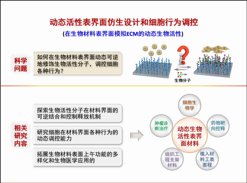 在生物体内,细胞膜表面受体与细胞外基质(extracellular matrix,ECM)内部活性配体之间的动态相互作用是各种细胞行为、生理和病理过程发生的关键。生物材料,作为人工的ECM,在与细胞相互作用时,其理想的状态应具备天然ECM的动态性能。如何借助分子策略和材料的仿生设计来模拟ECM的动态特性是生物材料和生物医学领域发展的关键基础科学问题之一。近年来,潘国庆教授课题组一直专注于智能生物材料表界面的研究,以模拟ECM内部活性配体的动态特性为生物材料表面仿生设计的中心,从生理响应性、生物功能和细胞行为调控的多样化、生物医学应用的需求出发,创新性地将多种动态可逆的相互作用用于材料表面的分子修饰,构建出可动态结合生物活性分子的ECM仿生表面,实现了多种细胞行为的表界面调控,并探讨了此类仿生动态表面材料在生物医学领域中的多种应用潜能。