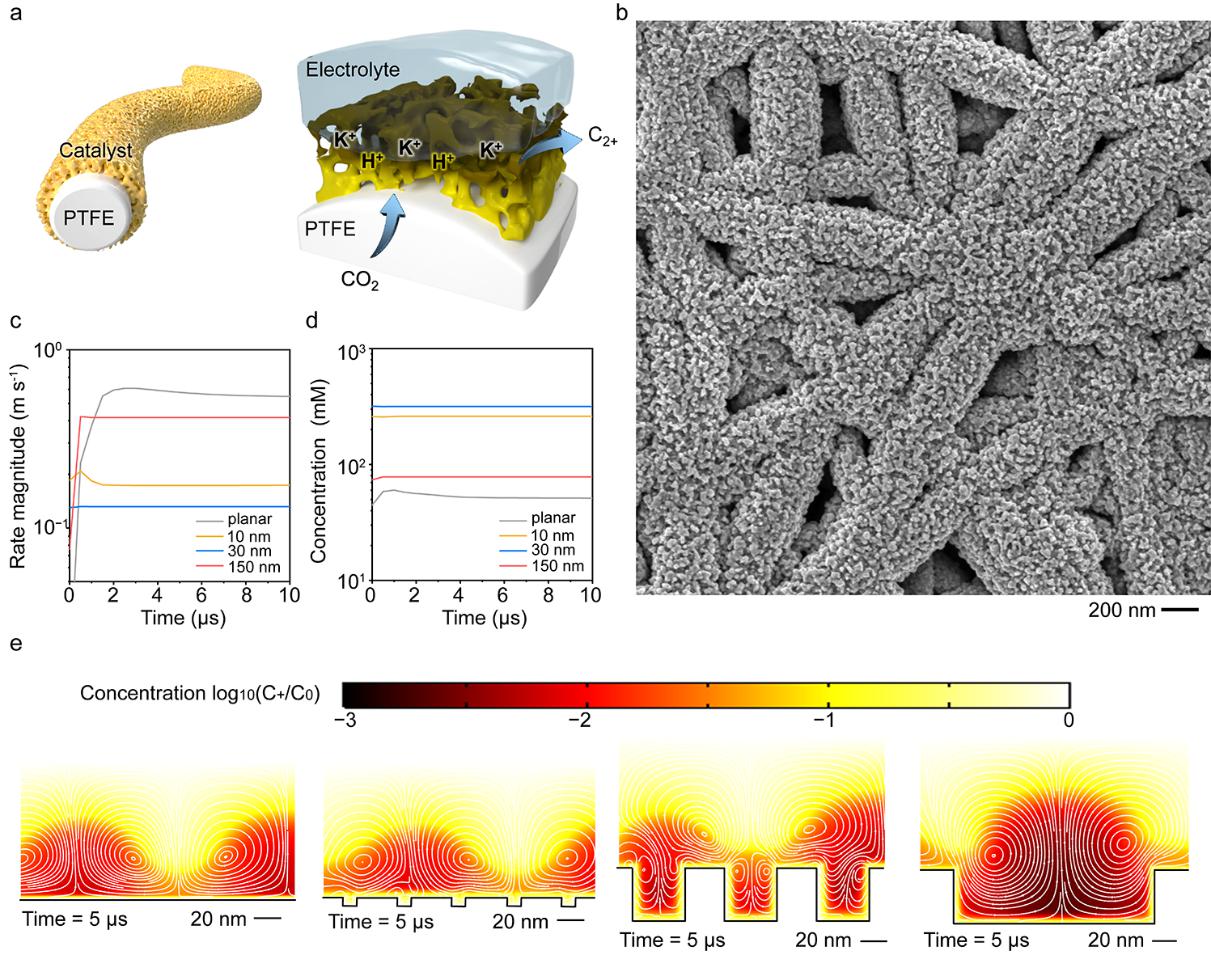 图2. a. 纳米多孔CuZn催化剂电化学二氧化碳还原示意图。b. 纳米多孔CuZn结构表征。c, d. 电化学流体动力学模拟纳米孔道内液体流速和离子浓度。