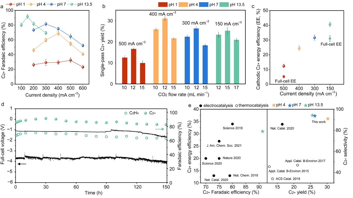 我们在薄层流动型电解池中进行电催化还原CO2实验,结合反应条件优化(电解液、电位等),最终实现了在酸性pH 4下31±2%的CO2–C2+单次转化率,>80%单次CO2利用效率。在单个CO2R流动电解槽中,我们实现了91±2%的C2+法拉第效率,其中73±2%的乙烯法拉第效率,31±2%的全电池C2+能源效率,以及24±1%的CO2单次转化率,在商业相关电流密度150 mA cm−2下运行超过150小时,达到当前的领先水平。
