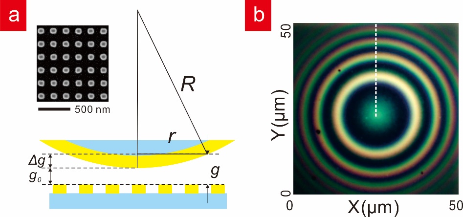 图1 (a)等离激元牛顿环实验示意图。(b)等离激元牛顿环实验照片
