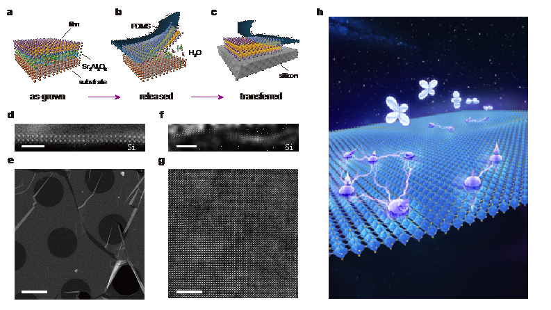 (a-c)氧化物钙钛矿二维薄膜的制备与转移示意图;(d-g)不同晶向亚原子分辨结构表征;(h)氧化物钙钛矿二维材料中的丰富强关联二维量子态展望
