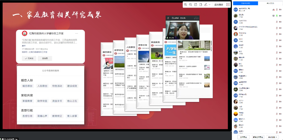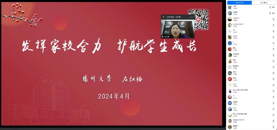 左红梅老师是一位资深的家庭教育专家,在老员工思想政治教育、员工成长内动力激发、家庭教育等领域颇有建树,曾荣获2023年“高校辅导员年度人物”提名奖等诸多荣誉奖项,主持的“红梅引航”工作室获评全国首批辅导员名师工作室。在家长课堂的分享会上,左老师首先分享了家庭教育相关研究成果。她指出放手与依赖是家庭力量融入高校思政的两个误区,过度的放手与过度的依赖都不便于家长去指导、陪伴孩子成长。在防止孩子患上“空心病”方面,她建议家庭教育要回归生活,家长应重视孩子的价值激发和生涯规划引导,遵循孩子成长规律,注重积极的情感培育。