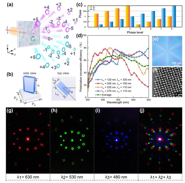 光场的多维调控是微纳光学的重要研究方向,而超构表面在光场调控中的优异表现有目共睹,因此研究者开始关注超构表面的复用和多种功能一体化实现,从而进一步推动集成纳米光子学的发展。其中复用是通讯和计算机网络中的常用概念,意为在一个信道上传输多路信号或数据,而在光学中通常意味着多个自由度作为独立的信号通道。利用各项异性结构单元实现偏振复用是复用超构表面的常用解决方案之一,此外超构表面可控的自由度还有波长、角度和模式等,通过结构设计可以将多个信息维度和功能集成到同一超构表面上。在超构表面相关的光场调控应用中,轨道角动量作为光场重要的内禀性质,在光场成像、全息及通信等领域都有着重要应用,因此相关的研究方向一直以来广受研究者关注。