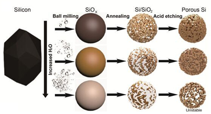 该课题组着眼于工业生产中的低纯度硅源(金属硅:纯度为99%),通过简单的球磨,退火(歧化反应)和酸处理的工艺,最终得到多孔硅颗粒。并且通过控制实验条件,能够精确调控多孔硅的孔隙率(从17%到70%)。同时多孔化硅颗粒运用在锂离子电池的负极方面,能够缓解其在嵌锂时发生的体积膨胀,获得了很好的循环及倍率性能。