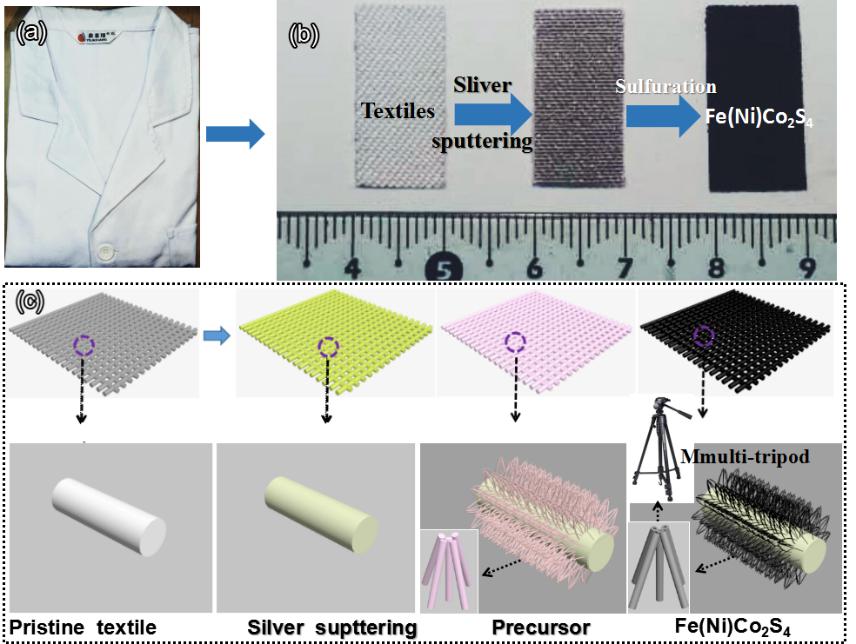 图1. 以普通纤维布为原料制备多角架阵列结构复合电极材料的过程示意图