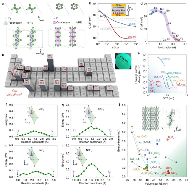 图1. 氟化物的晶体结构、介电特性和氟离子迁移过程。(a)稀土金属氟化物的晶体结构以及氟离子通过相邻四面体空隙(左图,T-T 路径)或八面体位点(右图,O-O 路径)的迁移路径。(b) 不同厚度LaF3薄膜的频率依赖的电容耦合。(c) 二元金属氟化物薄膜电容耦合的“元素周期表”。(d) 稀土镧系氟化物的电容值与阳离子半径的依赖关系。(e) 使用金属/氟化物/金属结构测量的氟化物薄膜的漏电流密度与等效氧化物厚度总结。