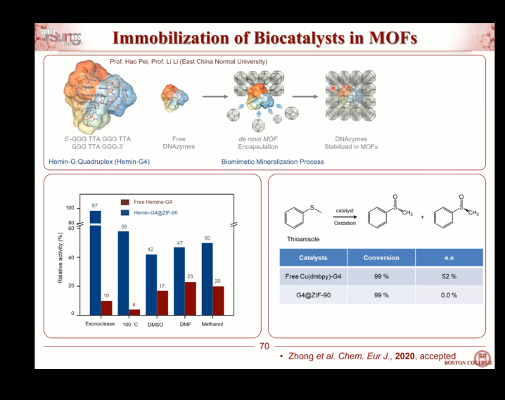 最后,宗家洸教授对生物催化剂、酶类固定于MOF中的相关研究进行了简要介绍。利用MOF固定化生物催化剂除改善催化过程稳定性、循环反应性等性质外,还能赋予这一催化体系新的功能。如利用从头固定的方法,在温和条件下MOF可在酶表面生长,该过程不像传统方式受MOF孔径及结构的限制,显著地扩大了MOF的可选择范围,也使生物催化剂的活性及结构得到了保护;同时,通过构建含孔洞的MOF结构可进一步兼顾生物催化剂的反应活性、选择性及结构的稳定性。宗家洸教授进一步结合DNA酶等相关应用做了简略的介绍。