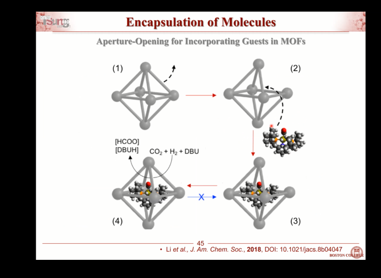 接着,宗家洸教授主要介绍了MOF封装分子催化剂的相关研究。受先前改变MOF结构连接体相关研究的启发,宗家洸教授提出了在质子溶剂中通过加热实现MOF连接体移除和重组的动态过程的设想,由于结合分子比MOF结构的“窗户”大而比孔小,可使分子催化剂进入MOF结构内,并实现封装;由于这一过程的特殊性质,为避免这一动态过程影响催化进程,后续催化反应可转移至非质子溶剂中进行,从而在发挥这一封装结构优势的同时确保催化进程中该体系的稳定性。基于此,通过对溶剂类型等反应条件进行控制,该方法下结合的分子催化剂不易从MOF中脱离,可实现良好的催化选择性和反应可重复性,同时可能够服传统方式中由于分子间相互作用导致催化活性下降的弊端。