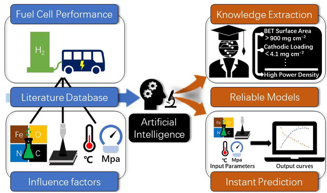 本研究整理了来自近10年本领域相关文献报道的超过10000个数据点,记录包括从催化剂元素组成,微观结构到燃料电池的操作条件与输出性能的信息构建数据库,采用人工智能领域广泛应用的16种算法进行学习建立数据驱动模型并为材料设计提供建议。