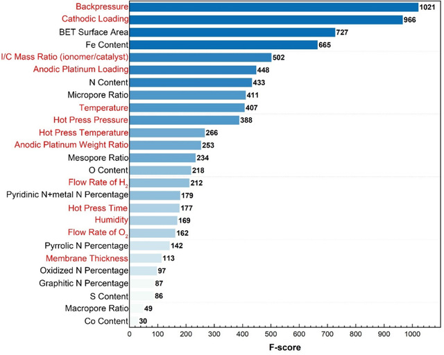 通过F-score统计,AI认为起到决定性因素的前五个因素分别为:背压,阴极催化剂担载量,催化剂比表面积,催化剂铁元素含量与浆料中离聚物/催化剂的比例。而在26个特征中,与燃料电池操作条件相关的13个因素大多被排列在催化剂微观层面化学结构特征之前。