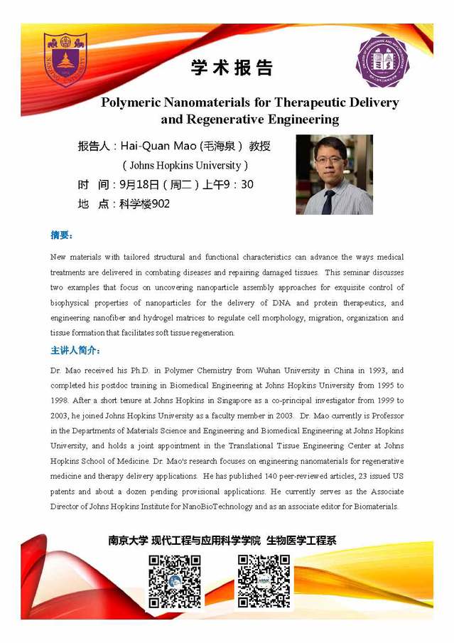 Johns Hopkins University毛海泉教授将在18号上午9点半在科学楼902做报告“Polymeric Nanomaterials for Therapeutic Delivery and Regenerative Engineering”。欢迎大家参加!
