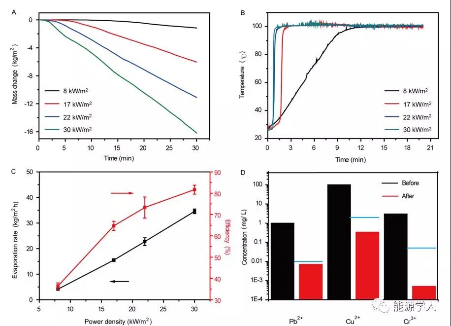 图2. 太阳能水纯化性能:(A) 在不同光照强度下的产水速率; (B) 在不同光照强度下产生蒸汽的温度; (C) 在不同光照强度下的光热蒸汽转化效率; (D) 纯化前后水质量检测。